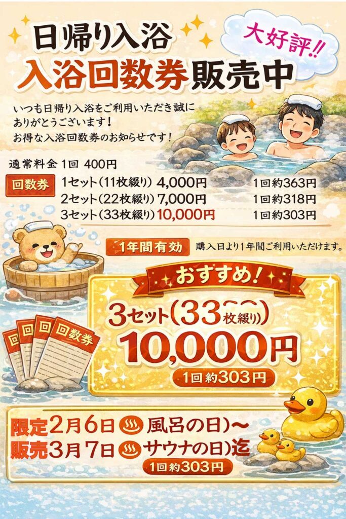 2026年2月7日 / 最終更新日 : 2026年2月7日 ビーエル支配人 お知らせ 日帰り入浴券販売のお知らせ 2月6日(風呂の日)〜3月7日(サウナの日)迄の限定で回数券の割引販売を実施中。 1年間有効です。