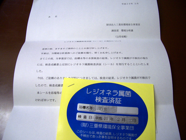 2008年2月26日 / 最終更新日 : 2008年2月26日 ビーエル支配人 ビジネスホテル レジオネラ 公衆浴場業も営んでおります関係で、レジオネラ菌の検査があります。 今回も無事水質調査OKで検査済みシールを頂きました。