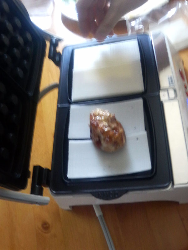 何をはさんでもいいので、今回は手始めに、子供が食べ残したたこ焼きをはさんで焼く事に。