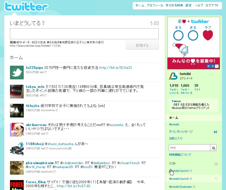 2009年12月24日 / 最終更新日 : 2009年12月24日 ビーエル支配人 パソコン・ネット フォロアーが1,000人越えました! twitterをはじめてだいぶ経ちますが、本格的に動かし始めたのが12月17日 から。今日で1週間が過ぎた所なんですが、なんと!フォローしていただいてい る方が1,000人を越えました。 ありがたい事です。リアルタイムな情報をつぶやいてますので是非フォローお待ちしております!ちなみに今日明日はツイッターの方限定のサービスがありますのでどうぞご利用お待ちしております。 http://twitter.com/hotelbl