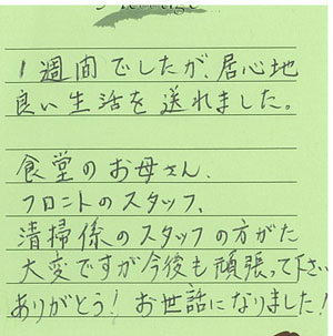2010年5月2日 / 最終更新日 : 2010年5月2日 ビーエル支配人 お客様の声 ありがたいお言葉を頂きました 長期にご宿泊いただいた女性よりありがたいお言葉を頂きました。 本当に仕事の励みになり従業員一堂喜んでおります♪