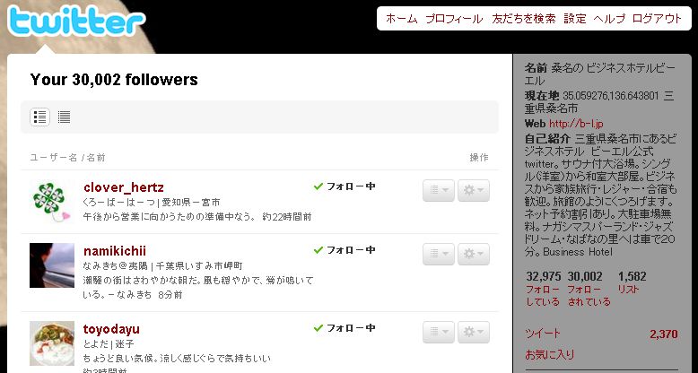 2010年6月7日 / 最終更新日 : 2010年6月7日 ビーエル支配人 パソコン・ネット 30,000フォロアー達成 本日Twitterのフォロアーが30,000人を越えました。はじめて172日目で6ヶ月弱でした。 たくさんのフォロアーさんのおかげで何とか続ける事が出来ました。 今後ともよろしくお願いいたします。 http://twitter.com/hotelbl/