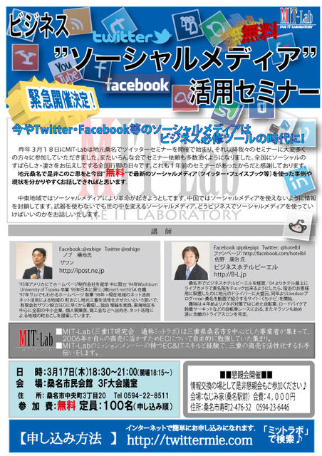 3月17日緊急開催!! ”無料”ビジネス ソーシャルメディア 活用セミナー in 桑名